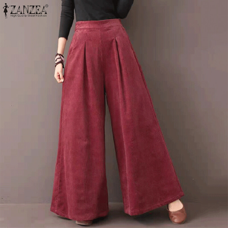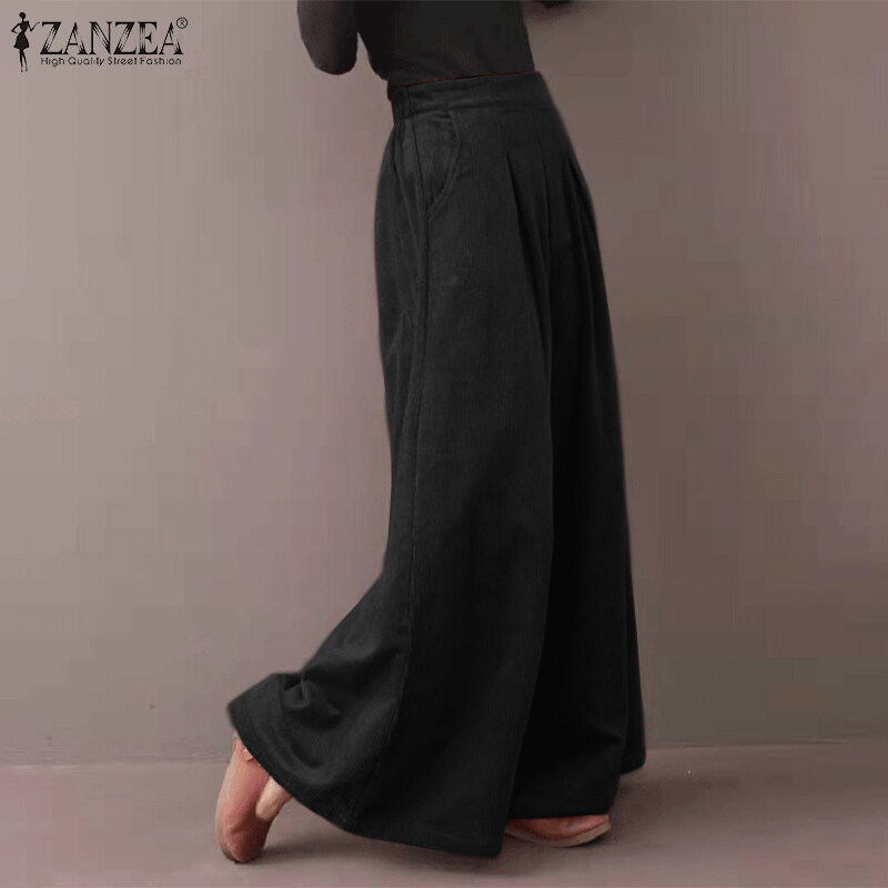 ZANZEA Womens Flare Wide Leg Pants Casual Corduroy Culottes High Waist Trousers