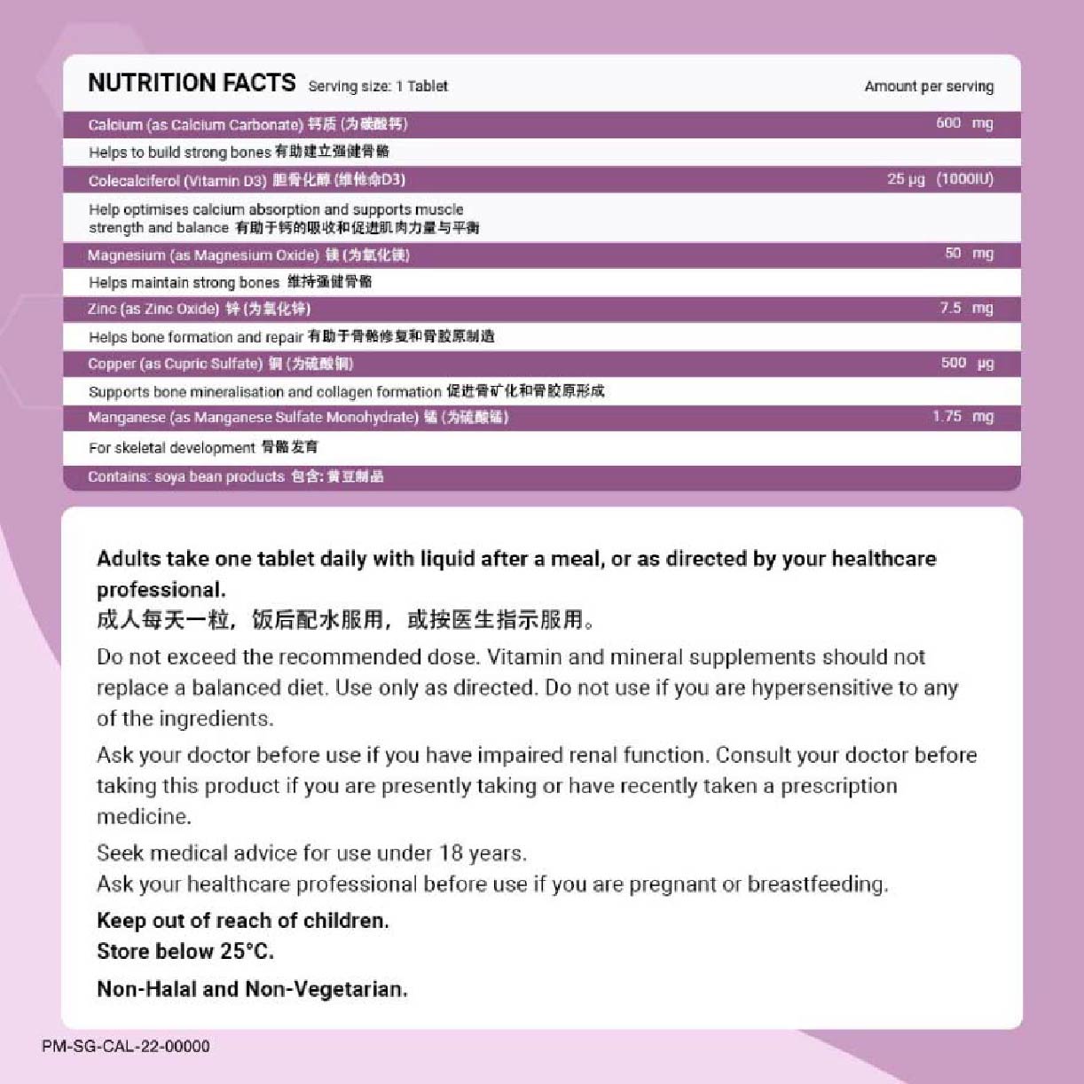 Elemental Calcium, Vitamin D3, Magnesium, Zinc, Copper, Manganese