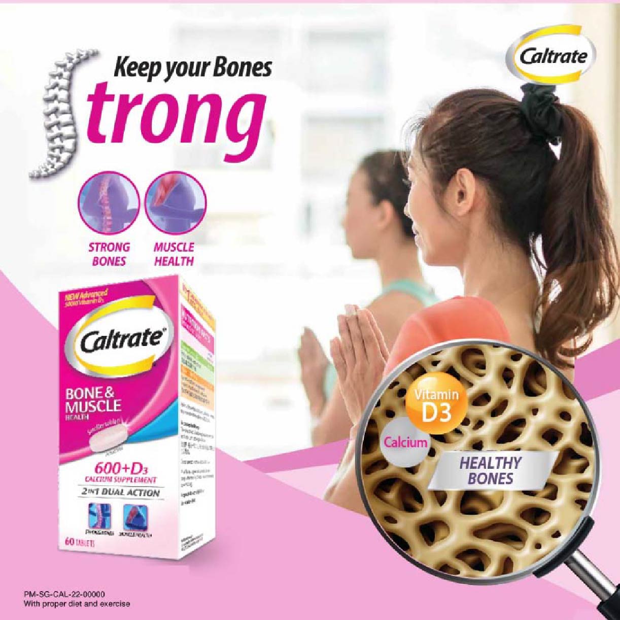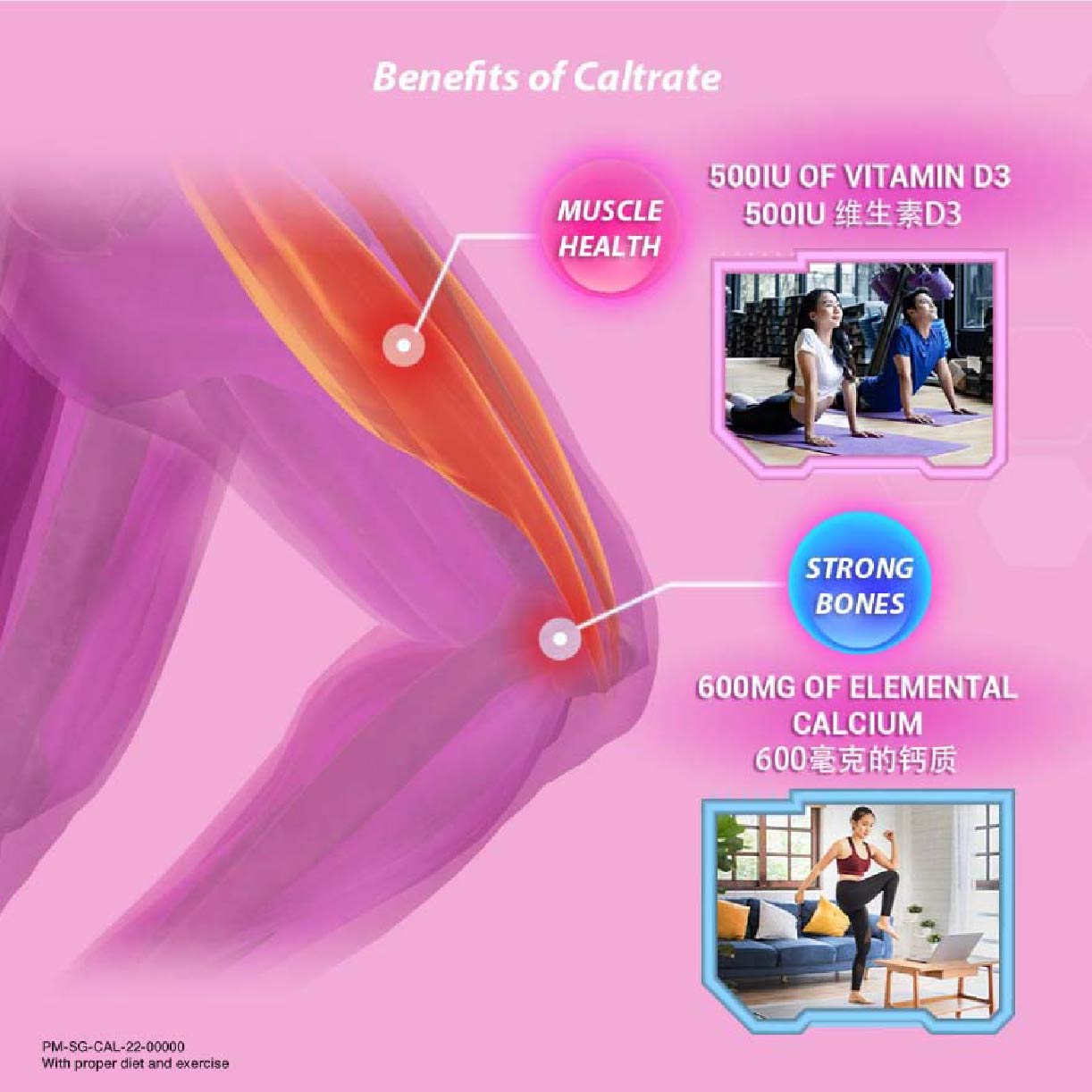 Caltrate® Bone & Muscle Health contains 600mg of Elemental Calcium for bone health and 400IU Vitamin D2 to help muscle health.