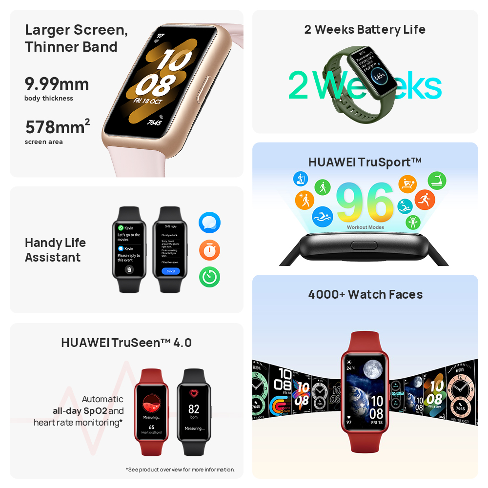• HUAWEI Band 7 isn’t just a health and fitness tracker, more is designed for body, mind, and soul. Ultra-Thin Design and Slim bezel-less screen outline the content onscreen, drawing attention to the services and features you love. Up to 14 days battery life to handle your long business trips and vacations. Health and Fitness Tru Series Technologies offers you with all-round care, SpO2 Blood Oxygen & Heart Rate monitor, Sleep Tracking, Stress Monitoring as well as 96 Workout Modes. HUAWEI Band 7 providing direct access to the most essential phone features, like incoming calls and messages, weather forecasts, and music controls, even to take an instant snapshot on your phone, or send out quick replies to messages!