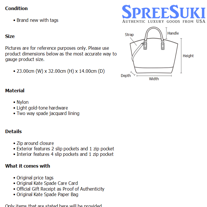 All our products are 100% authentic and purchased from Kate Spade stores in USA. We are a reputable registered business in Singapore and it is illegal to sell counterfeit goods in Singapore. This product also comes with a gift receipt which is printed by the Kate Spade store that we purchased the item from. It states the item that we purchased and the Kate Spade store that it was purchased from, proving the authenticity of the item. Buy with confidence.
