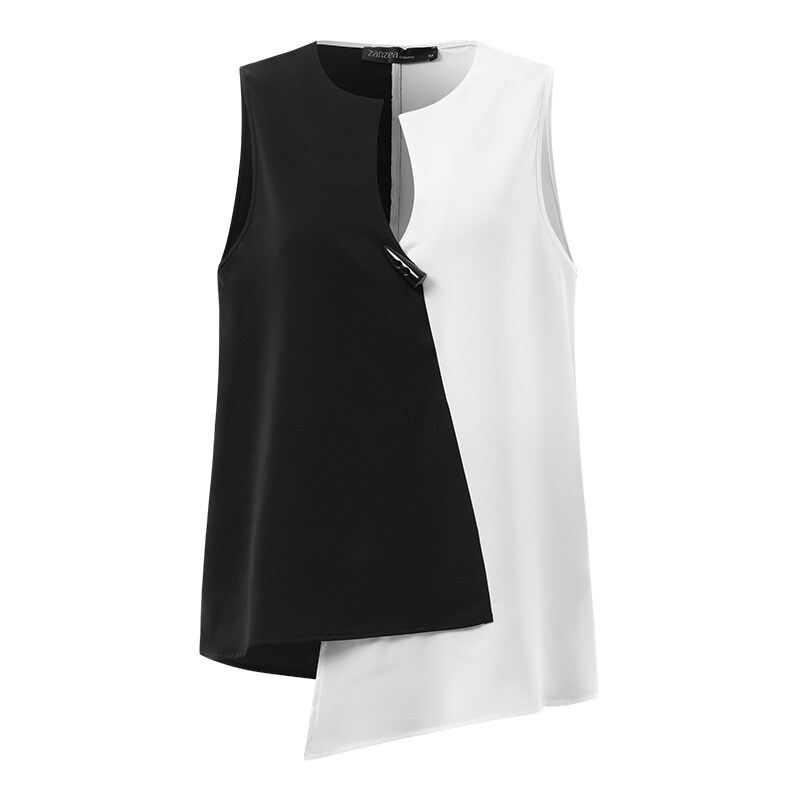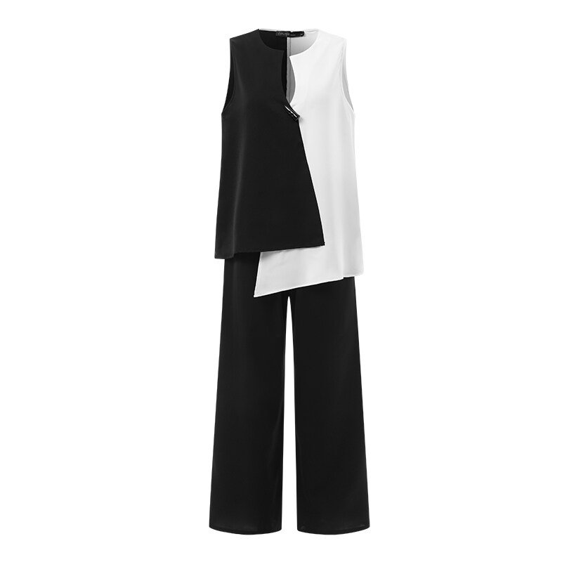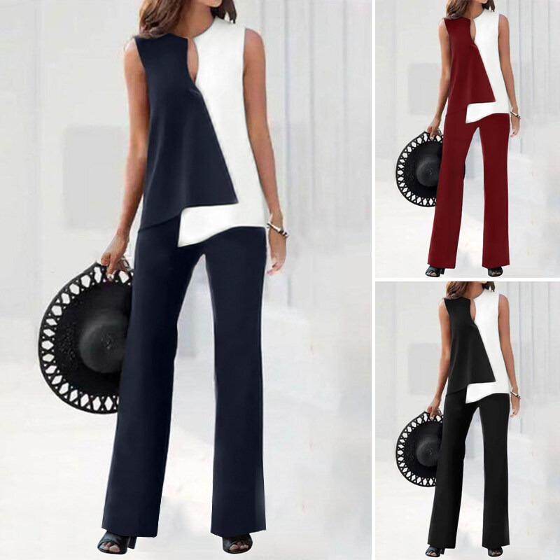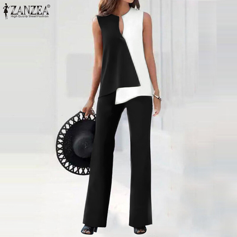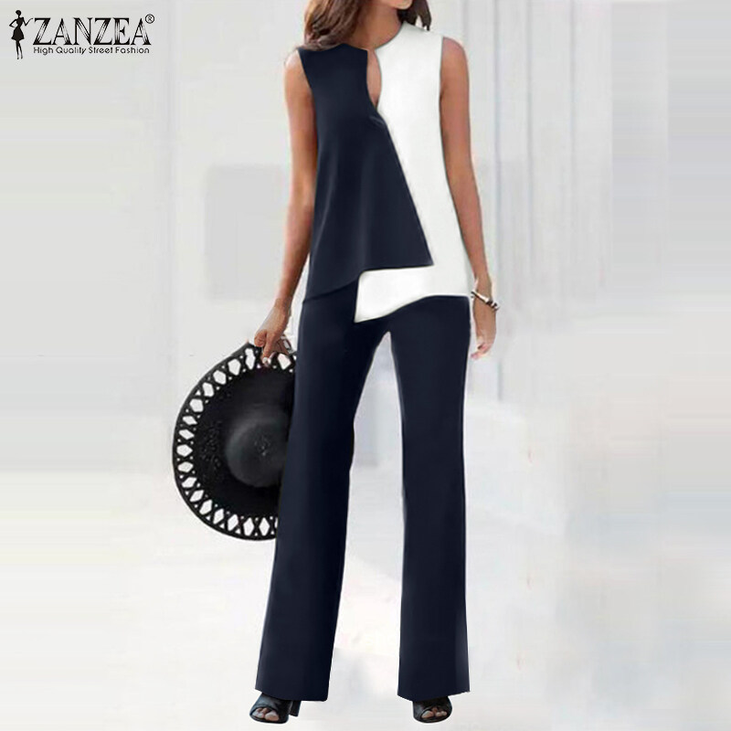 ZANZEA 2PCS Women Outfits Summer Sleeveless Patchwork Irregular Hem Shirt Trousers Suits Set