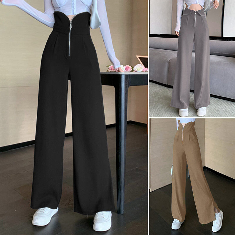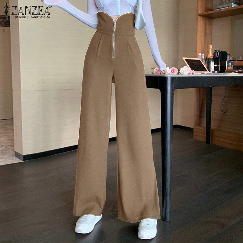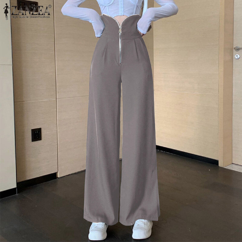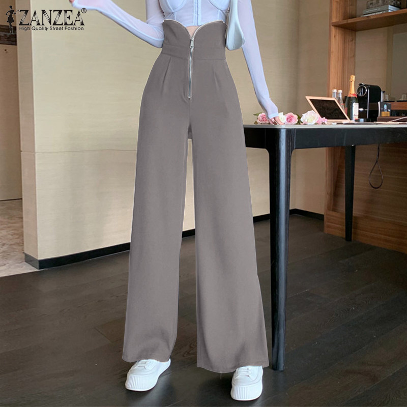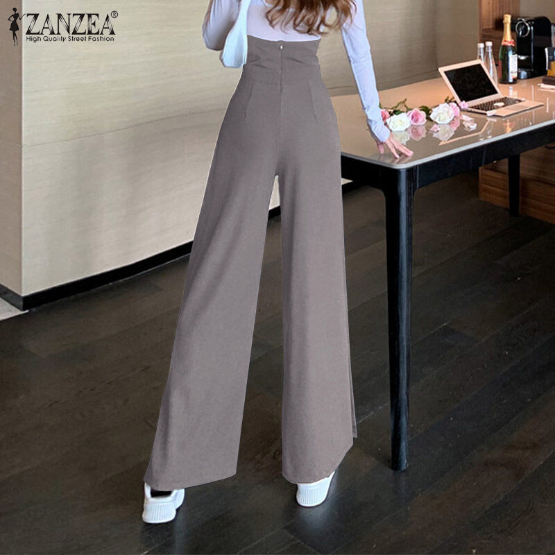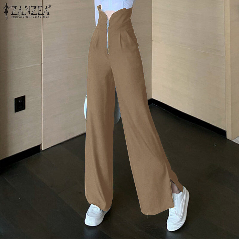ZANZEA Womens Fashion Wide Leg Plain Pants Zipper High Waist Baggy Split Long Trousers