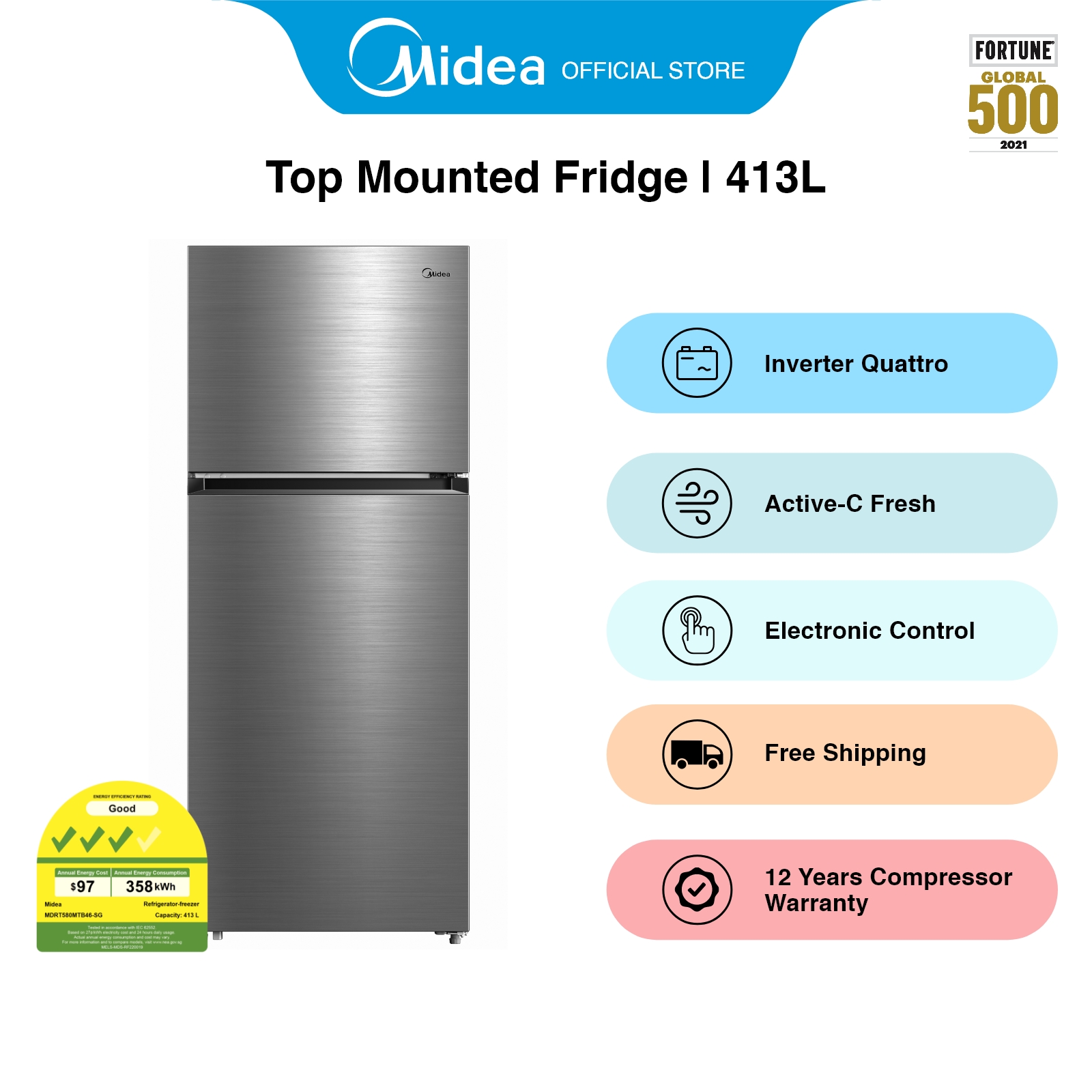 [Bulky] Midea MDRT580MTB46-SG Silver Grey Top Mounted Fridge, 413L, Energy Rating 3 Ticks