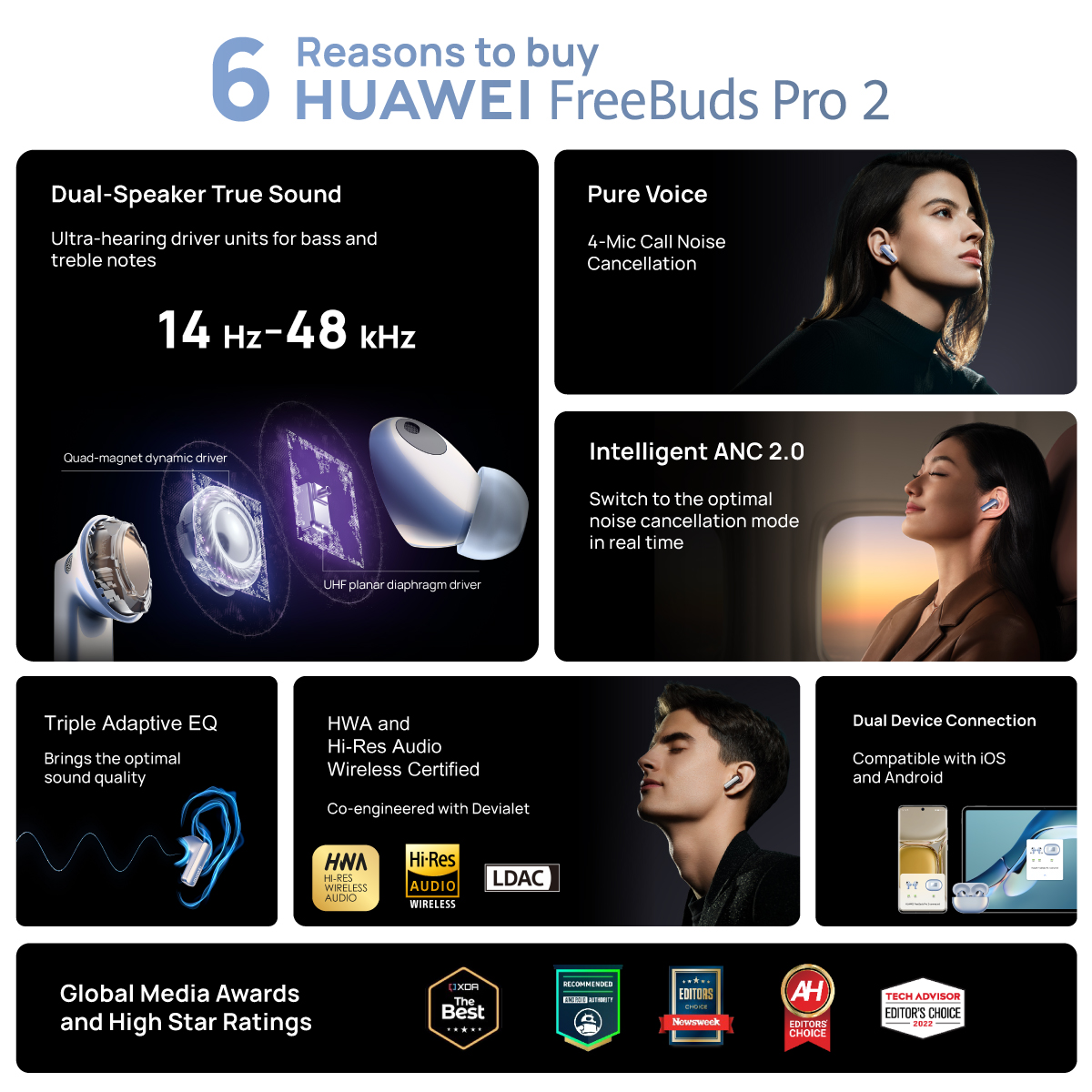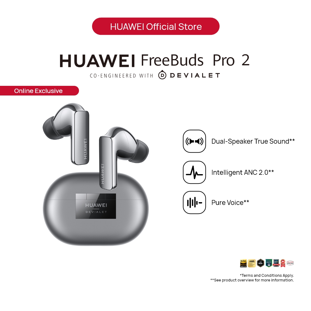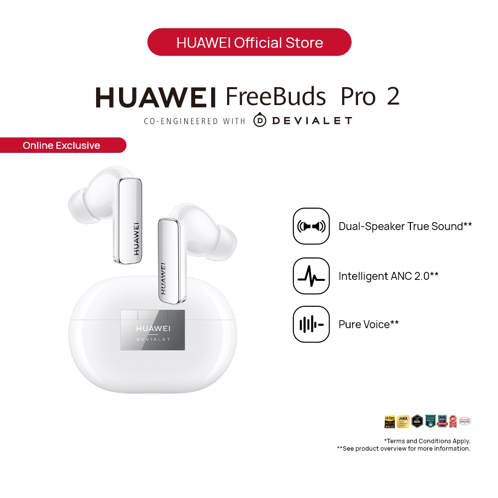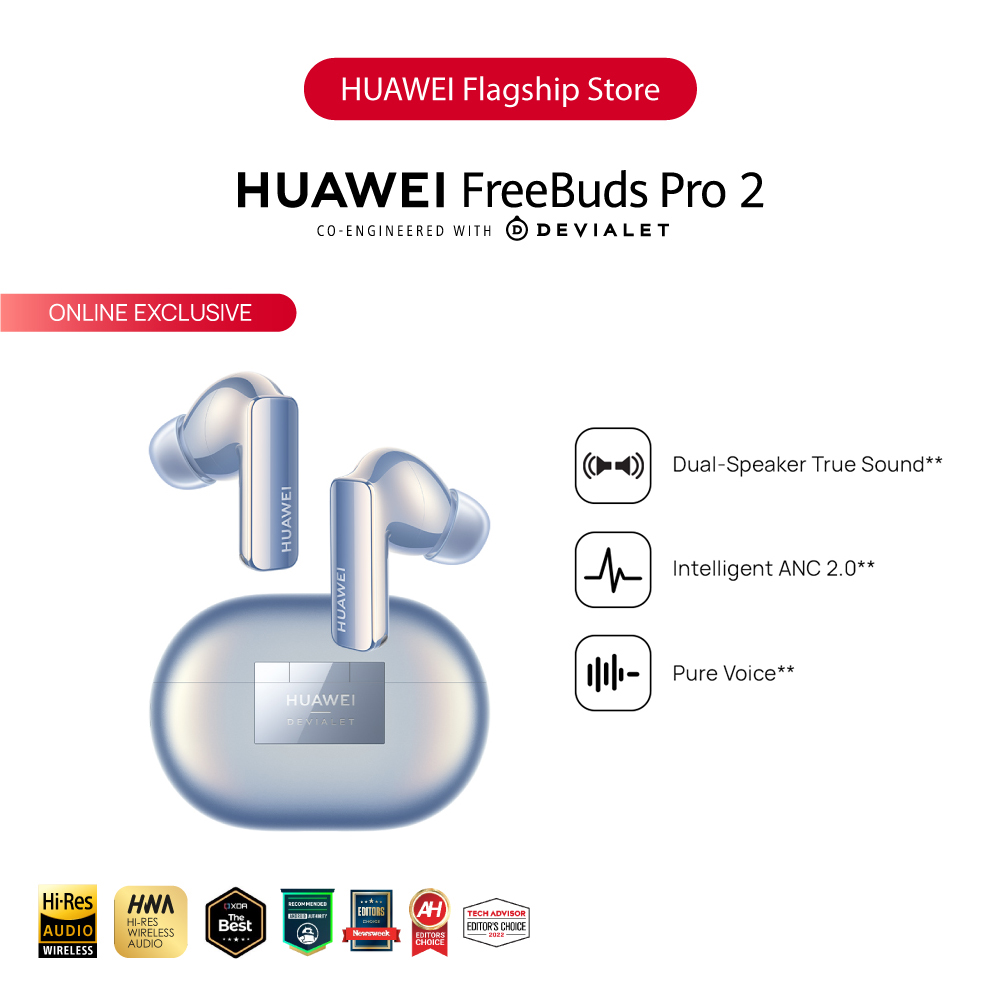 Dual-Speaker True sound: Lend your ears to HUAWEI FreeBuds Pro 2, and get lost in a rich cascade of sound, texture, and detail that far exceed your hearing range — from 14 Hz to 48 kHz — with luscious treble, surging bass, and everything between and beyond.* Pure Voice: HUAWEI FreeBuds Pro 2 never lets your surroundings get in the way of your calls, music, and movies, employing a bone conduction microphone, three additional microphones, and the Huawei-exclusive deep neural network (DNN) noise cancellation algorithm which has learned over 100 million voice samples to cancel out all manner of distraction, from noisy subway cars to windy conditions.** Intelligent ANC 2.0: The intelligent dynamic ANC 2.0 will switch your earbuds to the optimal noise cancellation mode in real time, with its ability to detect your ear canal structure, wearing status, and environmental noise, so that each note rings true. Triple Adaptive EQ: HUAWEI FreeBuds Pro 2 is smart at its core. It consistently brings you the optimal sound quality, by seamlessly tuning audio to the real-time volume level, your ear canal structure, and how you're wearing them. HWA and Hi-Res Audio Wireless Certified: HUAWEI FreeBuds Pro 2 supports LDACTM high-resolution codec, *** and is certified both by HWA and Hi-Res Audio Wireless, supporting blazing-fast transmission of up to 990 kbps, and transmitting pure high-fidelity sound that spares no detail. Dual Device Connection: Open the charging case, and your phone, tablet, or PC will automatically display a pop-up for pairing or reconnection. **** You can connect the earbuds to two devices at the same time and switch between the two devices automatically.