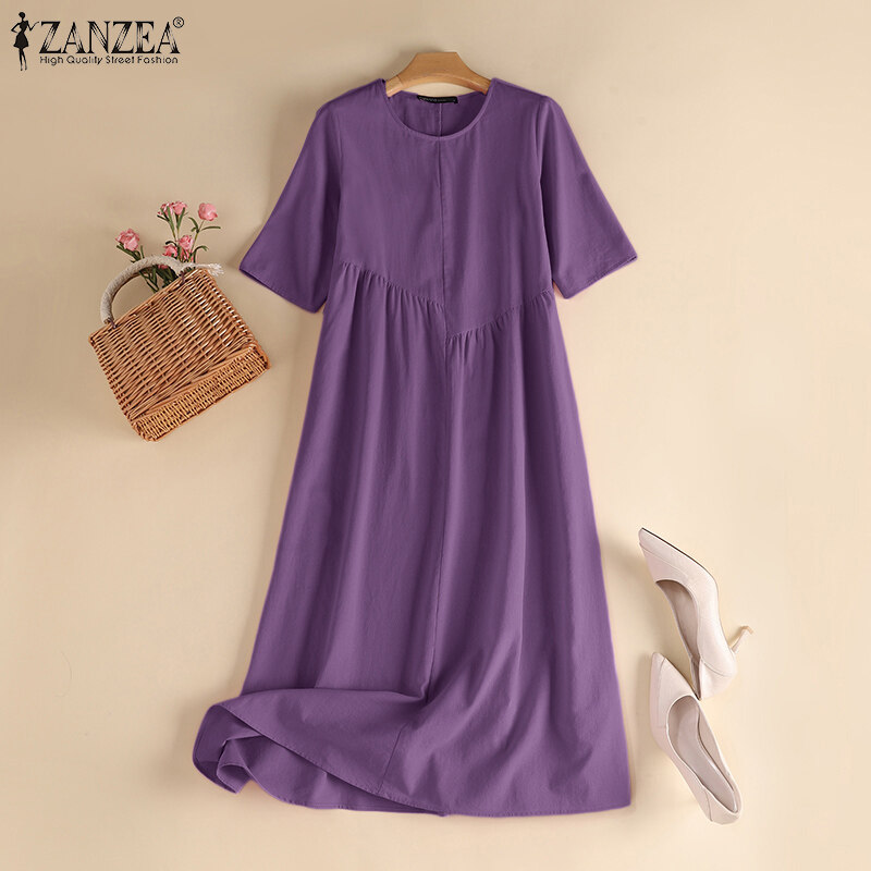 ZANZEA Women Leisure Cotton Pleated Short Sleeve Midi Dresses Bohemian Round Neck Sundress #8