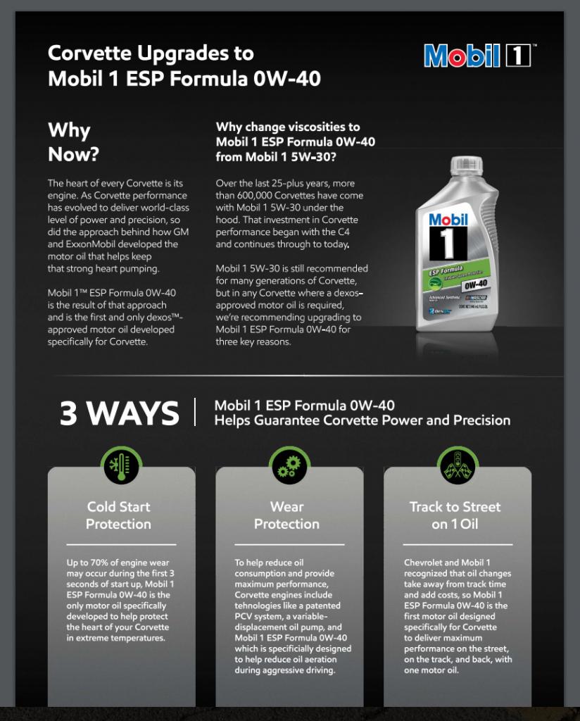 Mobil 1™ ESP Formula 0W-40 is the first and only dexos™ approved motor oil developed specifically for Chevrolet Corvettes. It is recommended for all C7 Corvettes* for both track and street use.